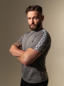 Szara koszulka z bawełny premium (210 g/m²) z lampasami na rękawach. Komfort i styl w jednym.